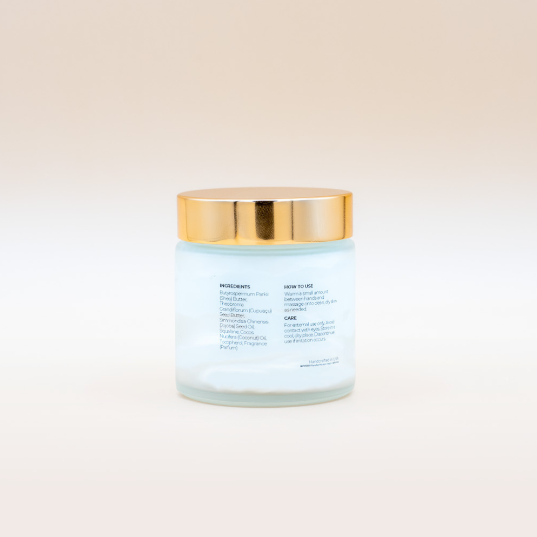 Our Whipped Luxury Body Butter is thoughtfully crafted with rich botanical butters and nourishing oils to deeply hydrate, restore, and soften the skin without dilution.