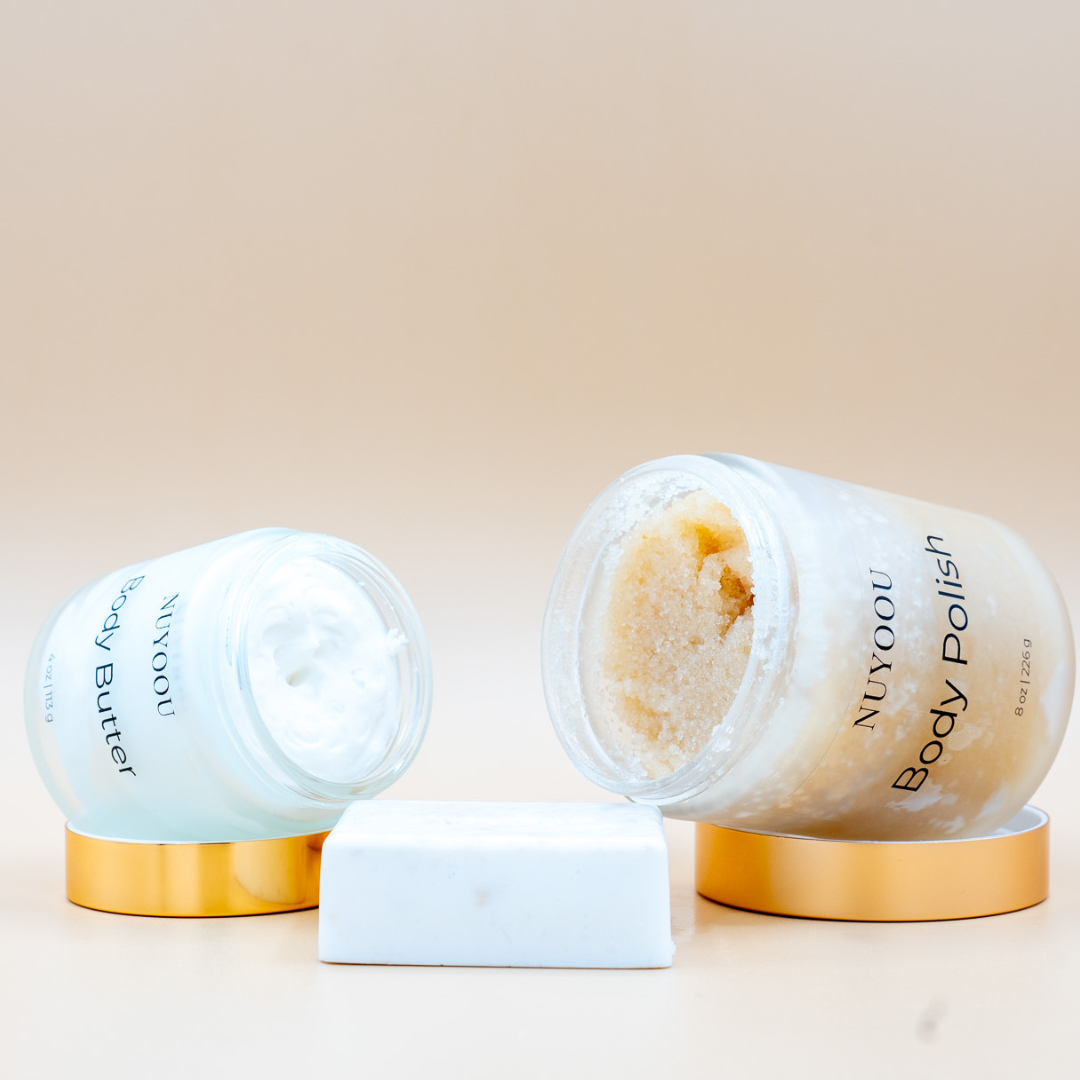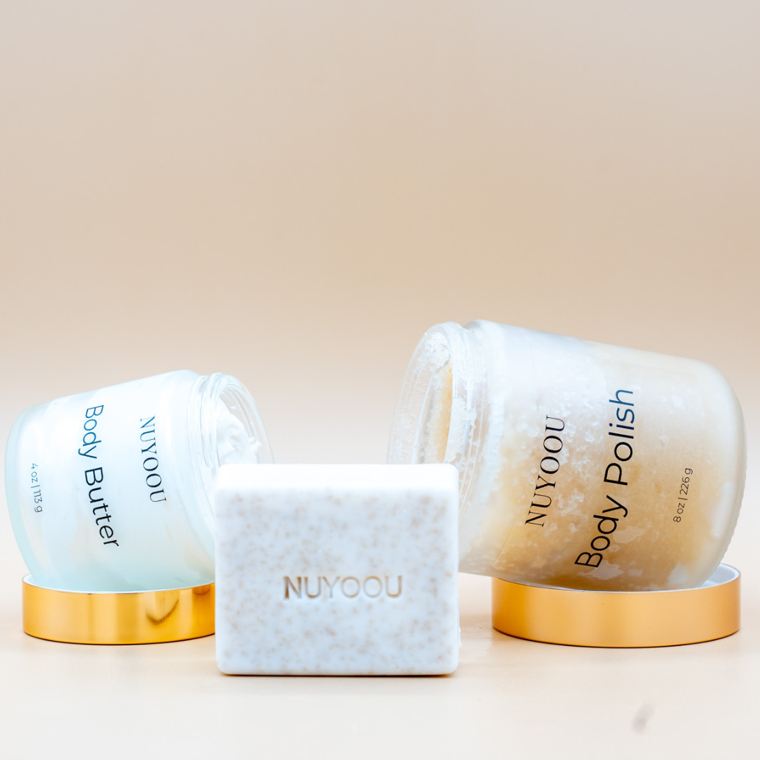 Introducing the Signature Ritual Bundle — a luxurious, three-step body care experience designed to nourish, smooth, and restore your skin from the very first use. This collection brings together three of NUYOOU’s most loved essentials, carefully crafted to work in harmony: our rich Body Butter, exfoliating Body Polish, and cleansing Body Bar. Together, they create a complete self-care ritual that transforms your routine into a moment of intention and care. Born from a passion for clean, nourishing ingredients and a desire for something better, each product in this bundle was thoughtfully created to deliver deep hydration, gentle exfoliation, and lasting softness without compromise. What’s Inside the Signature Ritual: • Body Bar Begin your ritual with a gentle, luxurious cleanse. Our Body Bar removes impurities while helping maintain your skin’s natural moisture, leaving you feeling fresh, clean, and balanced. • Body Polish Renew your skin with a smoothing exfoliation that helps remove dull, dry layers and reveal a softer, more radiant surface. The polish prepares your skin to fully absorb moisture while creating an instantly silky feel. • Body Butter Complete your ritual with deep, lasting hydration. Our rich, whipped Body Butter melts into the skin to lock in moisture, leaving it soft, smooth, and glowing throughout the day.